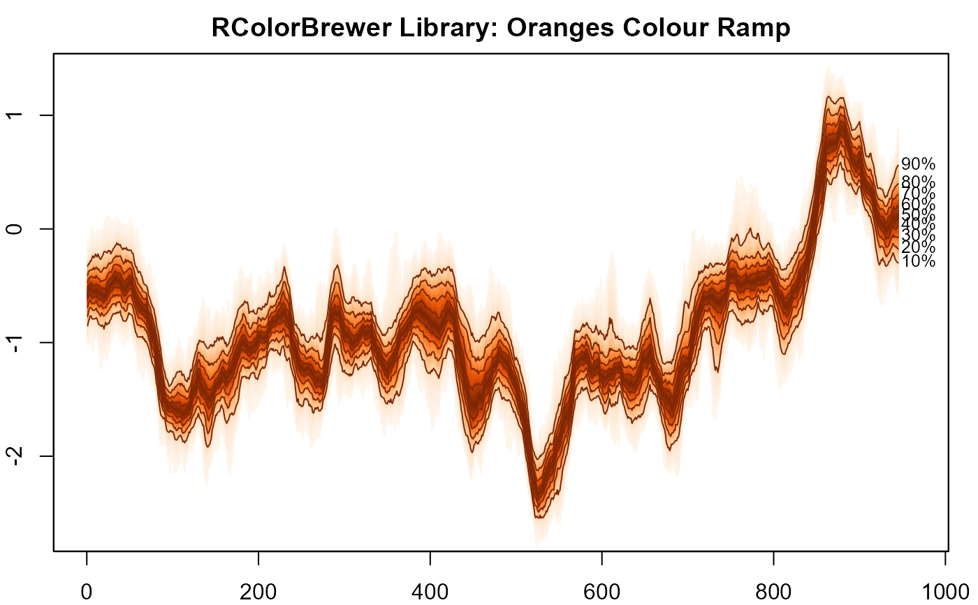 #> > plot(NULL, xlim = c(0, 965), ylim = range(th.mcmc)*0.85, main="RColorBrewer Library: Oranges Colour Ramp")