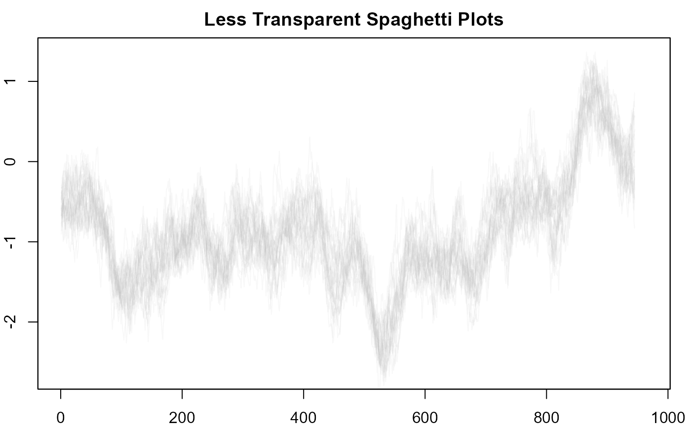 #> > plot(NULL, xlim = c(1, 965), ylim = range(th.mcmc)*0.85, main="Less Transparent Spaghetti Plots")