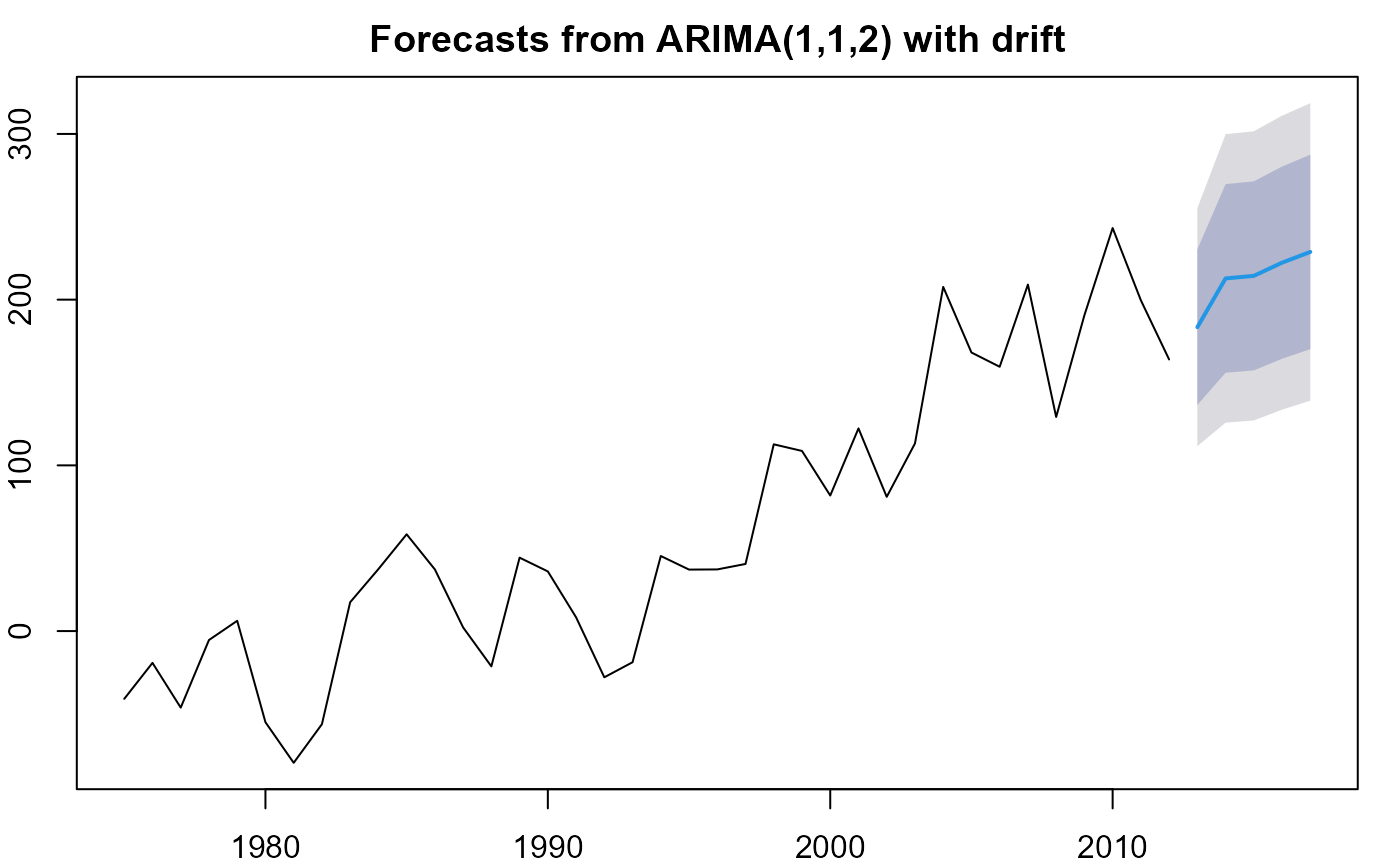 # plot in forecast package (limited customisation possible)