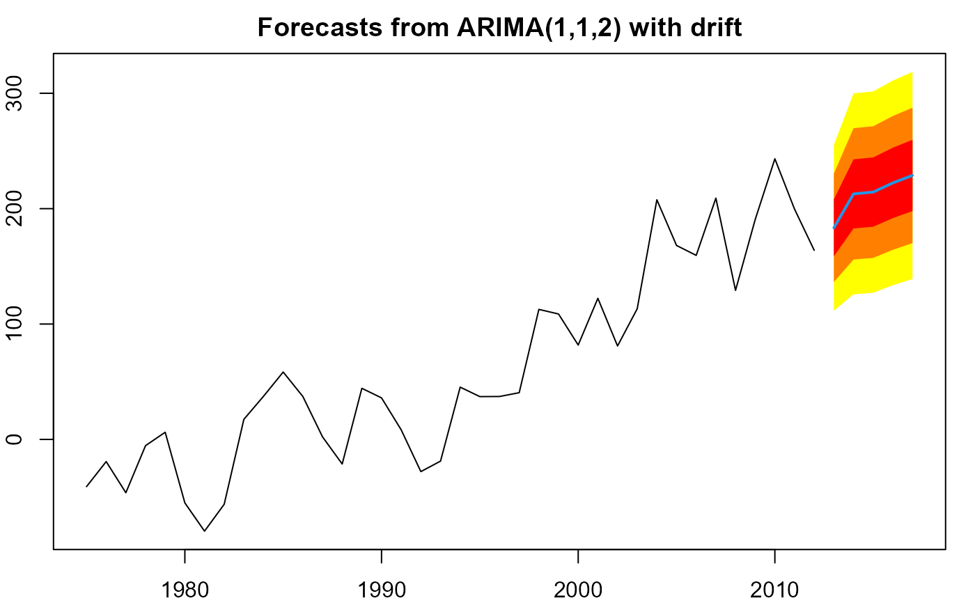 plot(forecast(m, h=5, level=c(50,80,95)),